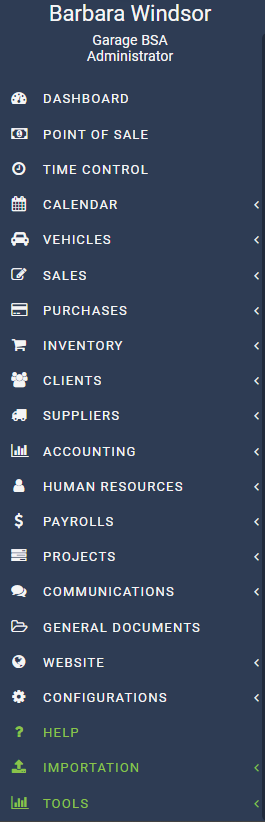 This way of managing and defining specific access to each user explains why Barbara Windsor, who is the company administrator, will see this comprehensive menu appear.