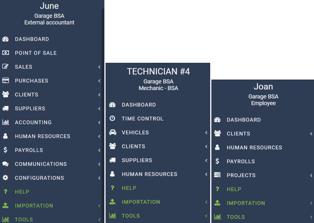 June, Technician #4 and Joan, who are respectively external accountant, technician and employee will see the following menus appear on their respective screens.