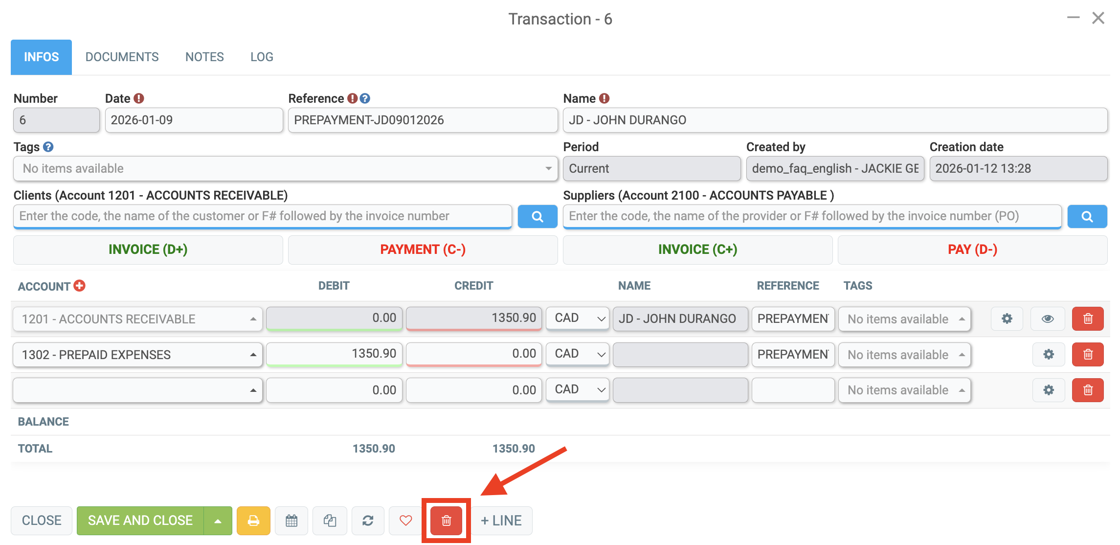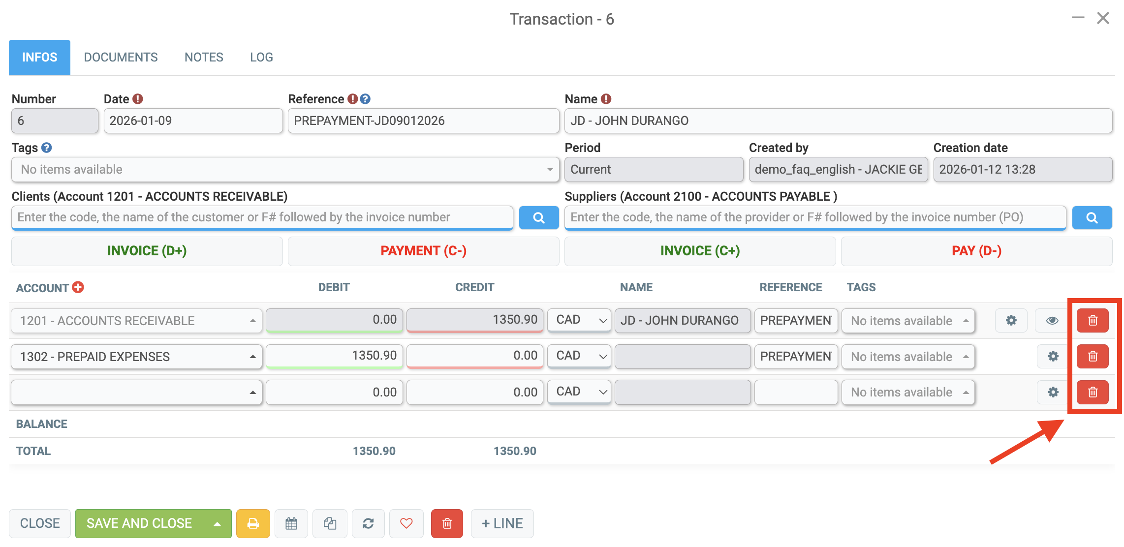If you want to delete all lines at once, click on the red trash can at the bottom of the transaction.