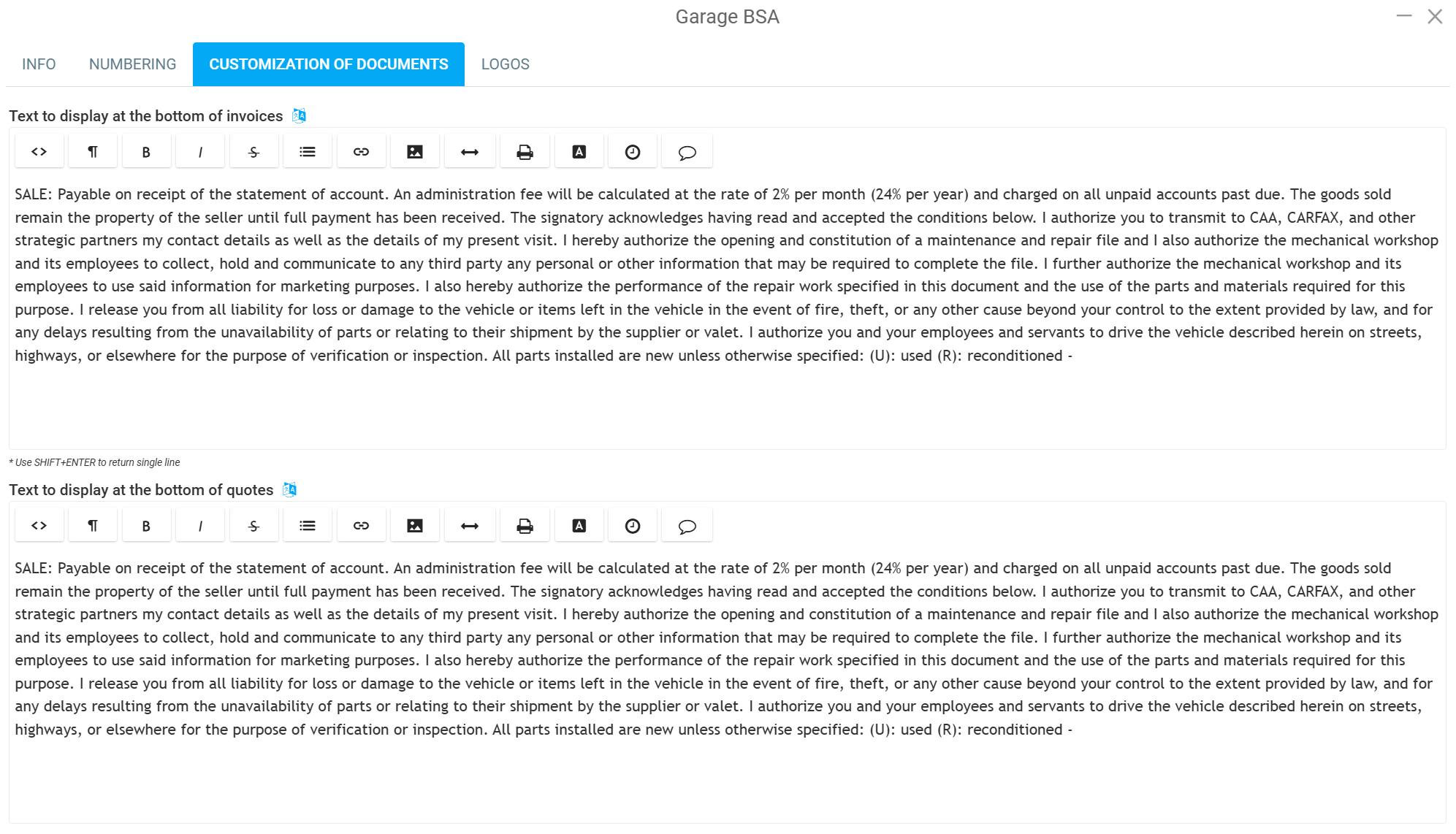 - Advertising message displayed on quotes and invoices