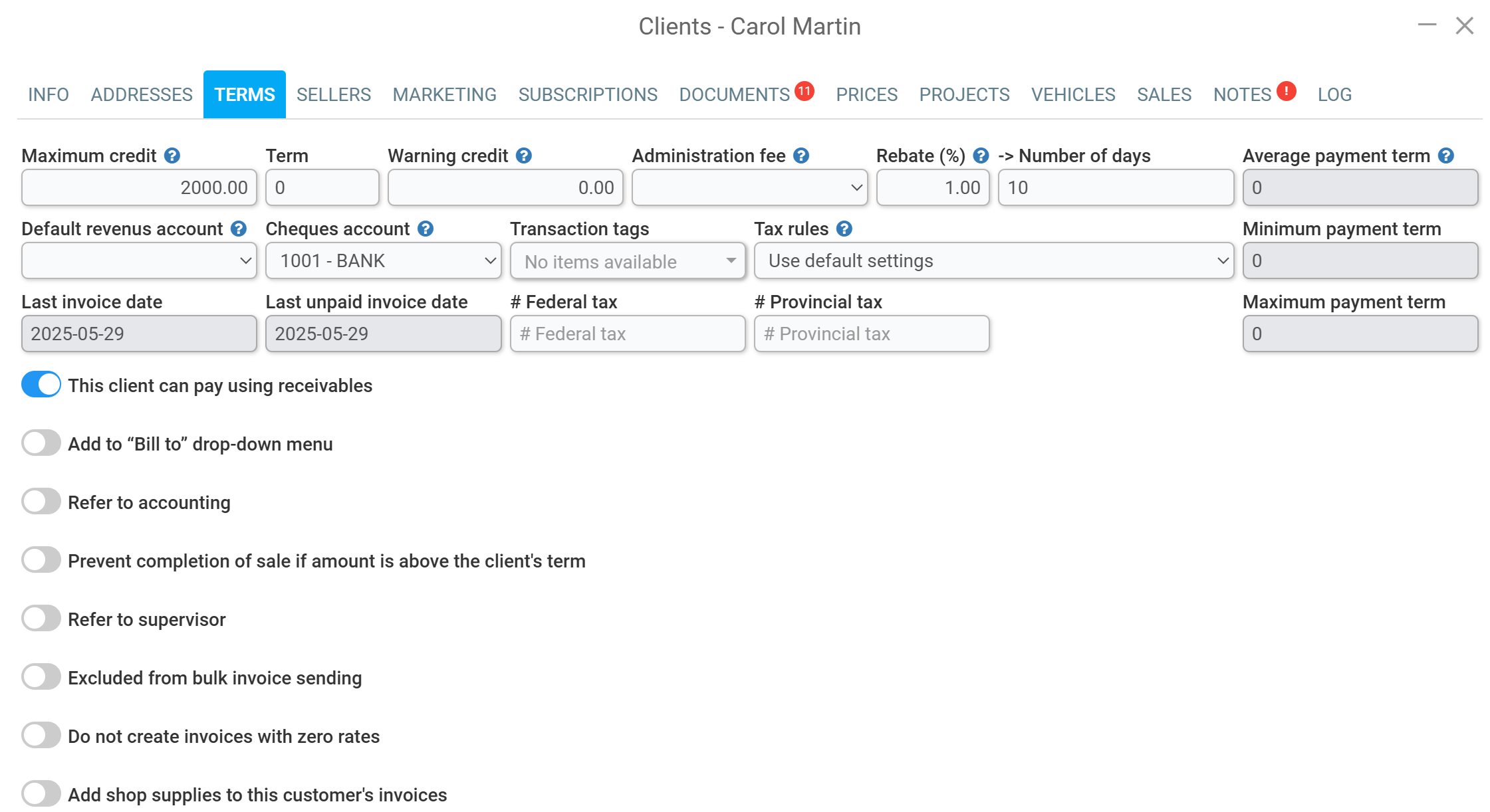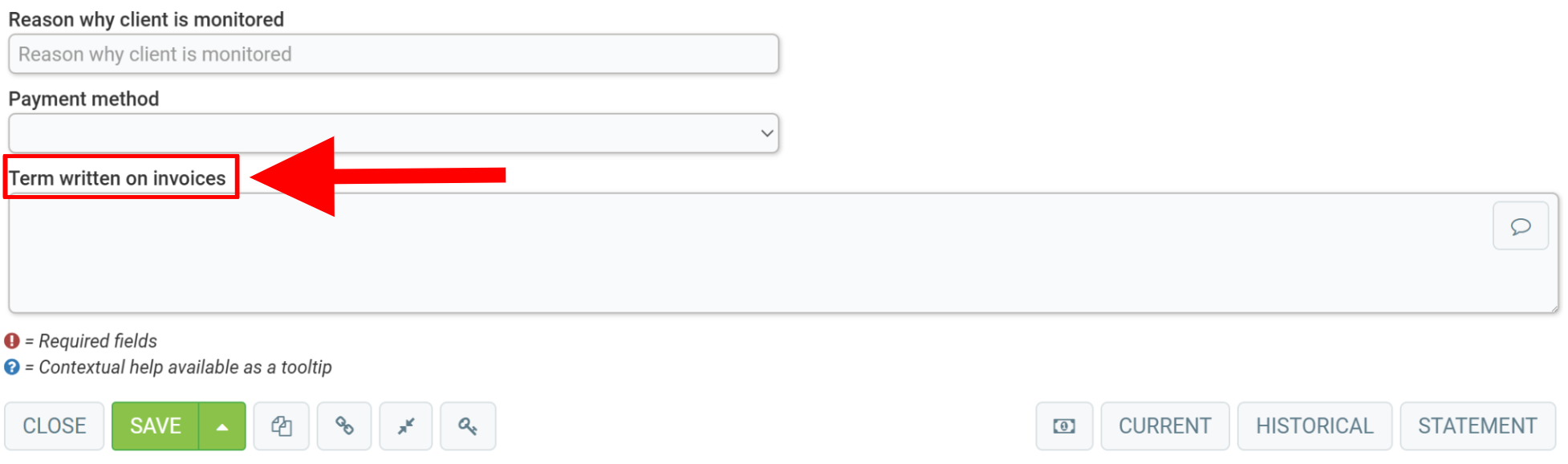 In the client file, go to the Terms tab and enter your message in the text box below Term written on invoices.