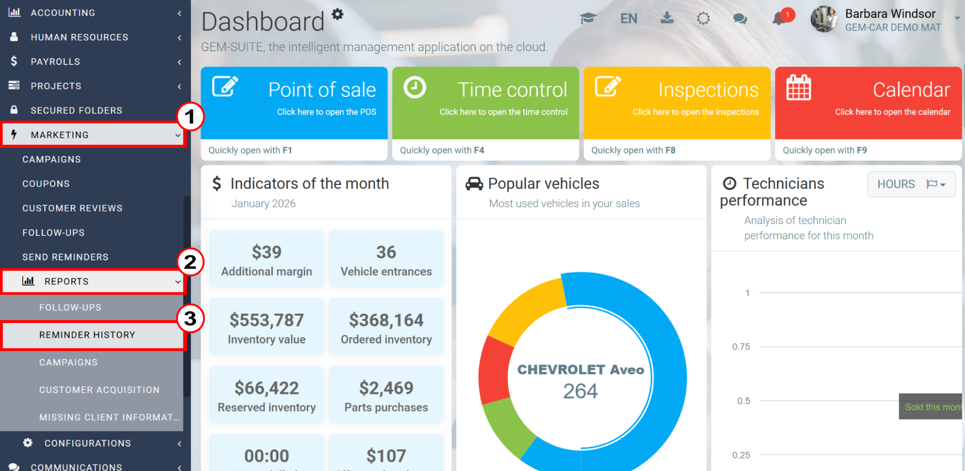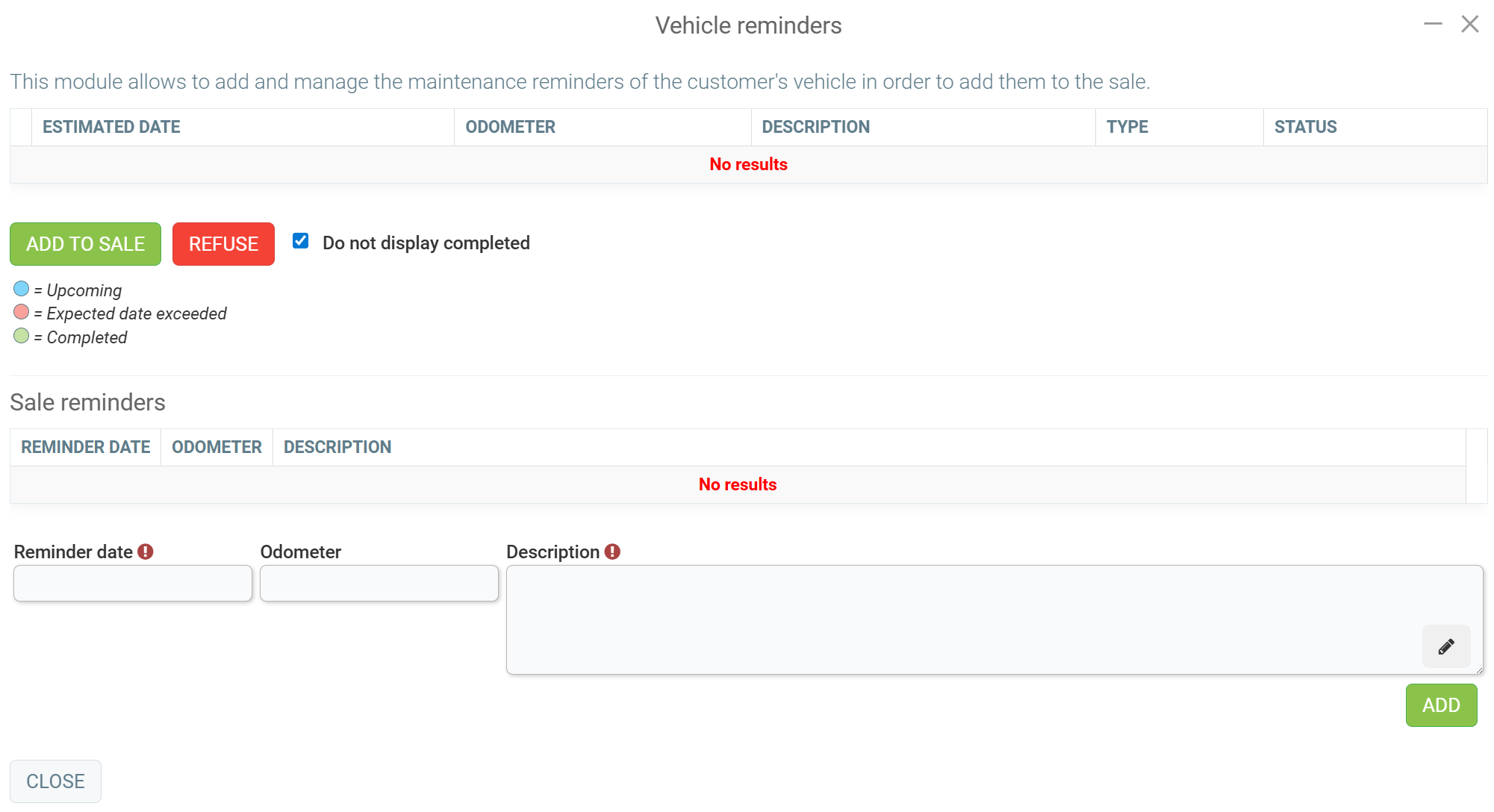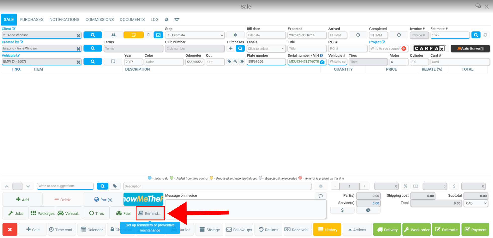 From the Point of Sale, once a vehicle has been added, look at the Reminders button located in the menu at the bottom of the screen.