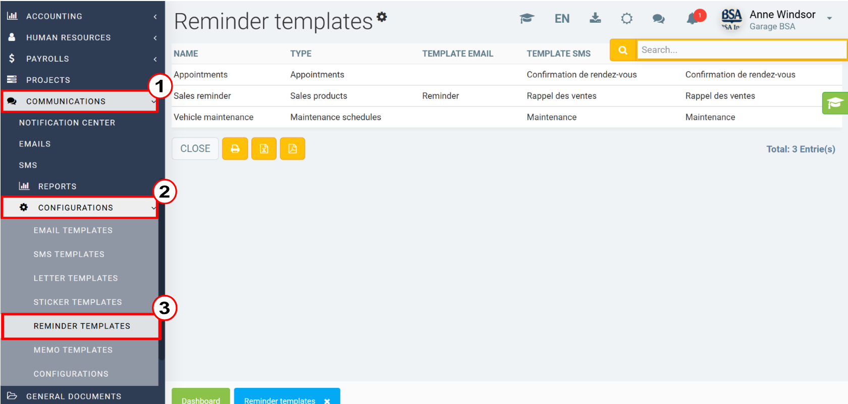 To see the list of reminders, click on Communications > Configurations > Reminder templates.