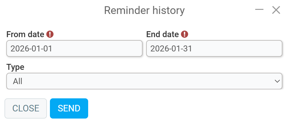 Select the start date, end date, and type (SMS, email, letter, print, verbal). Click Send.